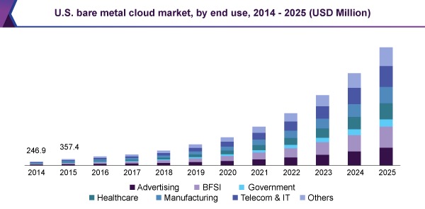 根据研究机构grandview的研究报告,2016年全球裸机云市场规模估值为13.2690亿美元,预计未来八年将大幅增长。对增强性能,简化数据操作和数据安全性的需求增加将导致在不久的将来,在各种垂直行业中更多地采用裸机云。目前,由于大量数据的增长和对有效存储需求的增加,全球裸机云市场由电信和IT推动。